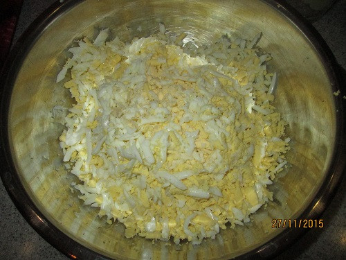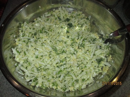 4. Сыр натираем на крупной терке, добавляем одно яйцо и перемешиваем. Начинка готова.