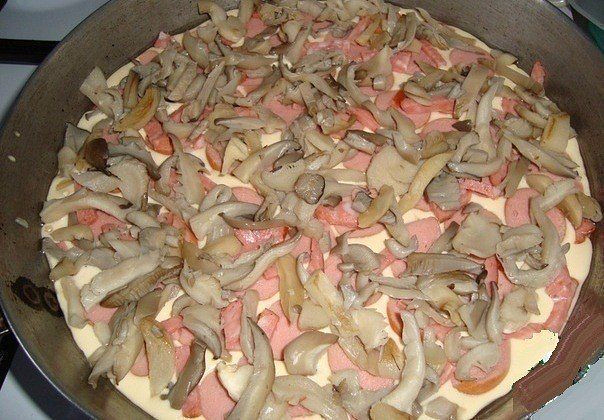 Смешать яйцо, муку, сметану, майонез. Тесто получается жидкое, как сметана. Тесто вылить на сковороду и уже сверху положить любую начинку. У меня сосиски, потом чуть копченой колбасы, слегка прожаренные грибы.Сверху помидоры. Сделать сеточку из майонеза и засыпать толстым слоем сыра.