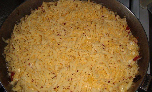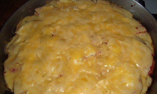 Ставим сковороду на плиту на 10 минут, огонь небольшой. Сковороду сразу накрыть крышкой, как только сыр расплавился, пицца готова.