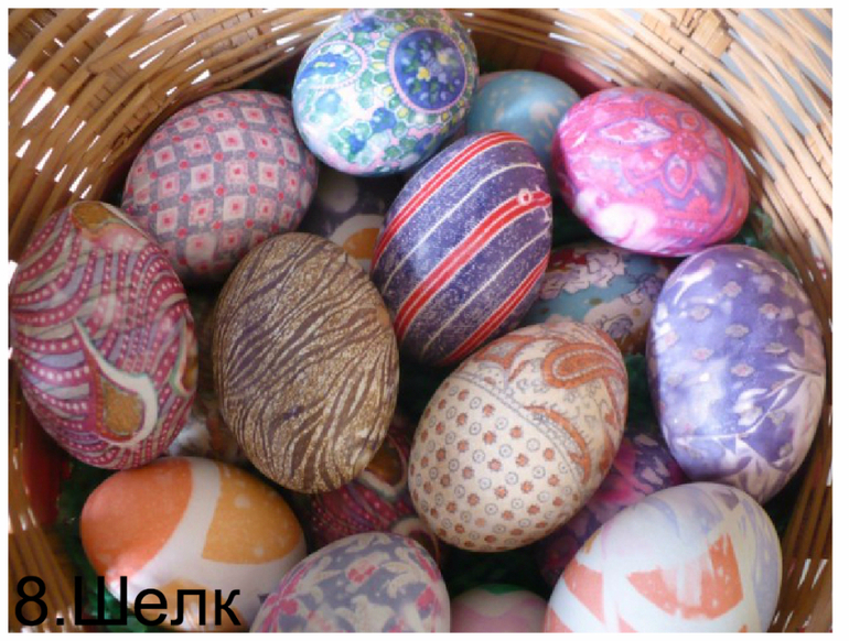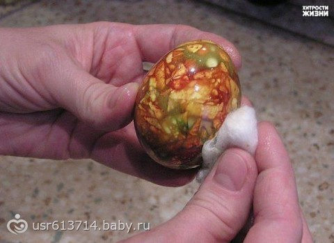 У кого есть ненужные шелковые платки или галстуки тому подойдет этот способ окраски яиц.Внимание! Для этого способа берем сырое яйцо .Смачиваем толковый лоскут водой ,оборачиваем яйцо и завязываем сверху..,Поверх оборачиваем белой хлопковой тканью и снова завязываем .Кладем яйца в кастрюльку с водой и вливаем четверть стакана уксуса 9%. Доводим воду с уксусом до кипения и после этого ,уменьшив огонь, варим наши яица на медленном огне 30-40 минут.После достаем яйца, ждем пока они высохнут и только потом разворачиваем .