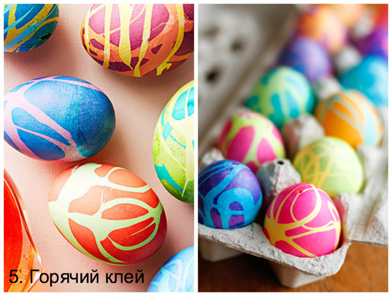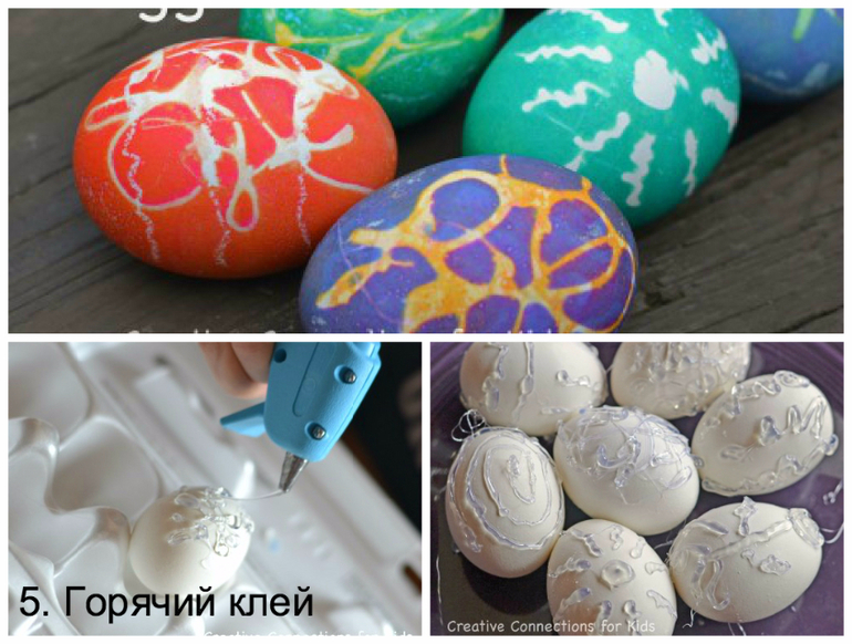 Это у кого дома есть пистолет с горячим клеем. Рисуем на яйце горячим клеем все что угодно.После красим яйцо.Когд яичко высохнет отдираем наш клей.В этом случае узоры будут белые.Можно сделать узоры от клея цветными.для этого красим яйцо,сушим,наносим клей,сушим и снова красим.