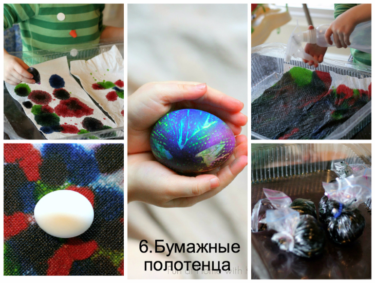 Самое то для детей! Одна салфетка= одно яйцо. На влажных салфетках чиркаем фломастерами от души.Заворачиваем яйцо и скрепляем резинками для денег.оставляем на ночь.