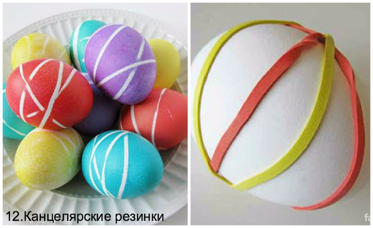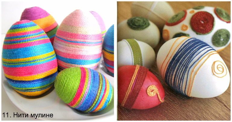Обмотать сырые яйца нитями мулине разных цветов и сварить вкрутую.Можно просто обмотать пустое яичко.