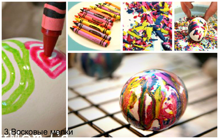 Так же восковыми мелками можно красить яйца до варки.Рисунок проявится по окончании процедуры окрашивания.