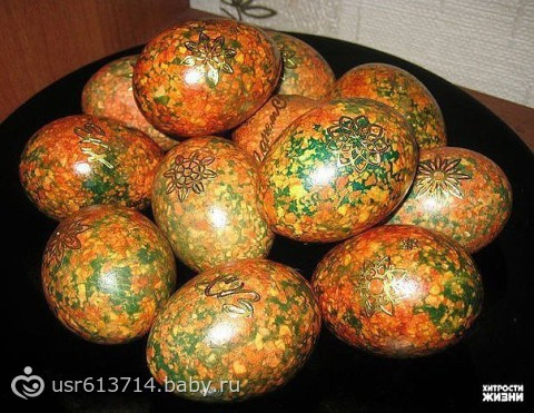 Узоры из растений .На мокрое яйцо приклеиваем листья петрушки ,укропа или других растений,так же можно взять цветы. Хорошо разглаживаем и помещаем в капроновый мешочек.Капроновый мешок можно сделать из светлых капроновых колготок,носок и т д. Плотно завязываем и опускаем в краситель. После , высушиваем и вытаскиваем из мешочка.