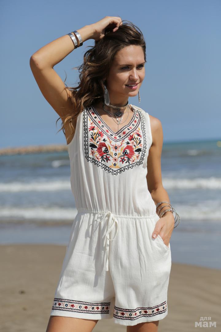Комбинезон очень приятный к телу. Верх с широким вырезом и яркой "цветочной" вышивкой. Свободный силуэт, лямки на плечах, растегиваются на пуговицах. Идеально садится практически на любую фигуру.