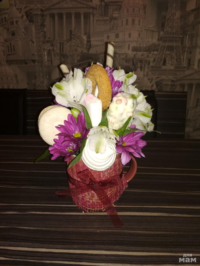 Если хочется порадовать скромным, но милым и запоминающимся подарком, стоит обратить внимание на этот оригинальный букетик в ярких красках со сладостями, цветами.