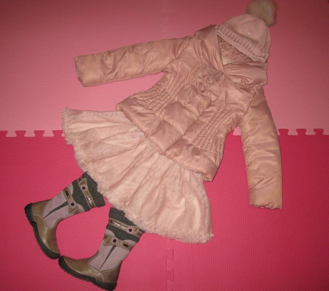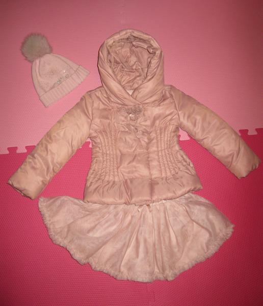 Курточка на весну-осень, оригинал, цвет пыльной розы, маркировка 4года, реально можно начинать раньше, с 93 до 104см. В комплекте с шапочкой, усыпанной стразами и натуральным помпоном, в тон к куртке, тонкий 100% меринос, производство Италия, на Ог 47-50
