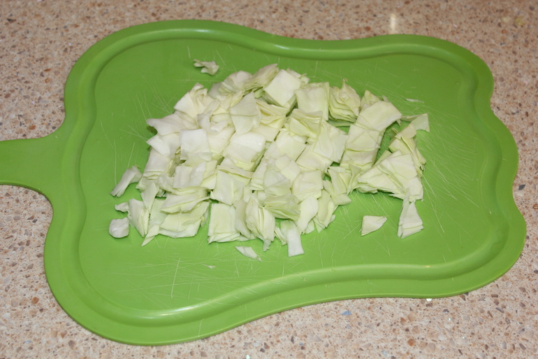 Капусту порезать кубиками (мельчить не нужно, голубцы не котлеты, блюдо будет смотреться красиво, если капустные квадратики будут хорошо заметны. В кипящую воду опустить кубики капусты, дать прокипеть в течение 5-10 мин.