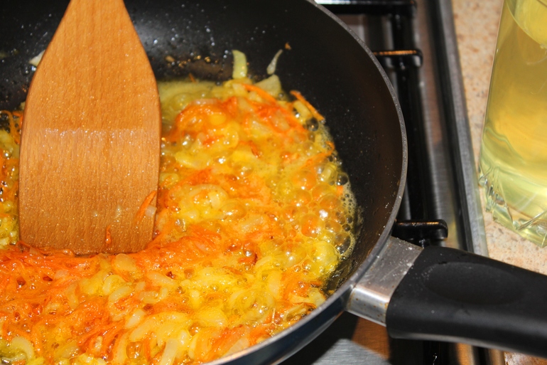 Пассеровать лук и морковь на растительном масле. Добавить 1 - 2 столовые ложки муки, обжарить муку вместе с овощами