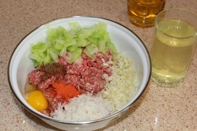 Рис отварить, измельчить репчатый лук. Добавить к фаршу паприку, черный молотый перец, соль, яйцо, капусту, рис