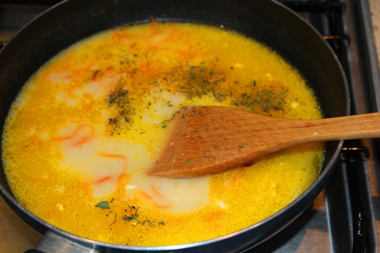 Добавить пряную зелень (укроп, петрушка, сельдерей), лавровый лист, посолить, поперчить по вкусу. Дать прокипеть 5-10 мин.