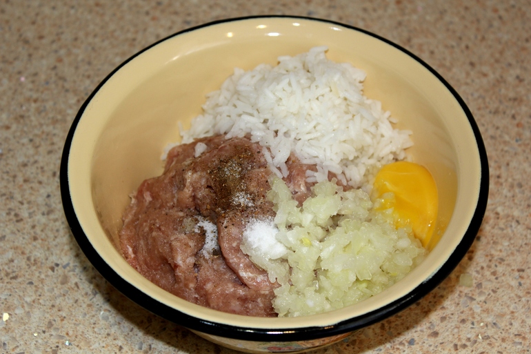 К фаршу добавить отварной рис, мелко порезанный лук, яйцо, соль и черный молотый перец по вкусу