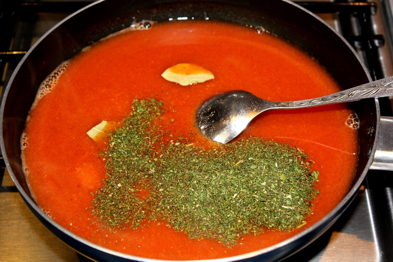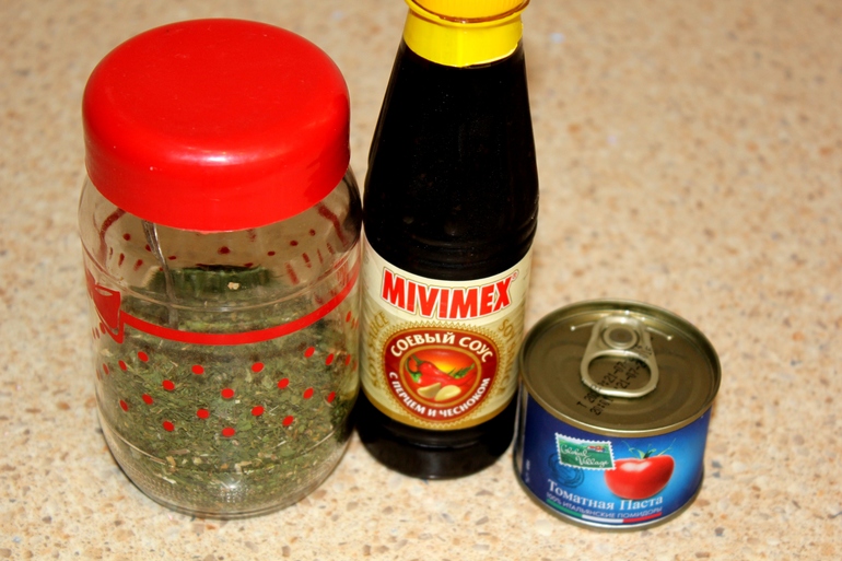 Для соуса: томатная паста, соевый соус, мука, пряная сушеная зелень, соль, черный молотый перец