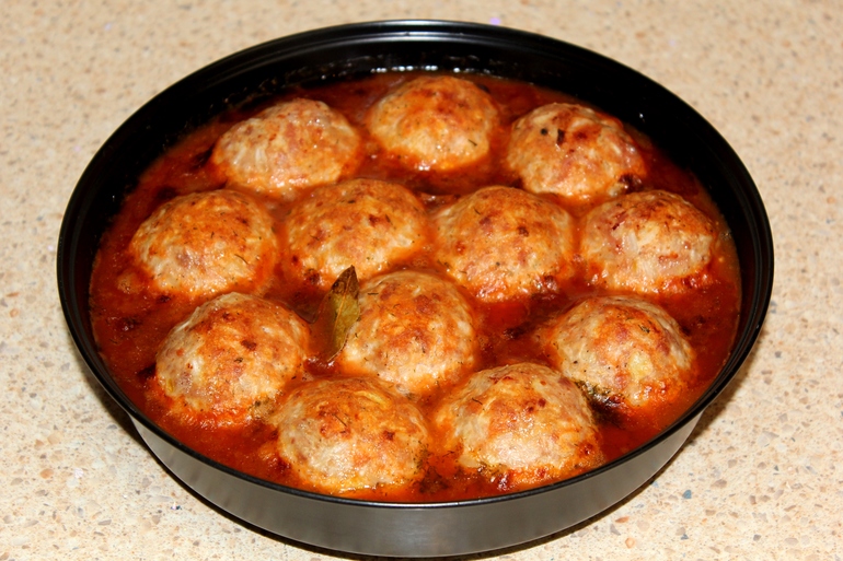 Тефтели достать из духовки, добавить к ним приготовленный томатный соус, вернуть в духовой шкаф и запечь на гриле. Вот таким образом. Готовые тефтели гарнировать картофельным пюре, гречневой кашей, рисом, гороховой кашей