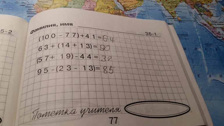 Сейчас перешли к примерам со скобками.. И все равно эта козявка продолжает решать в уме. Так что столбики нам наверное пригодятся только с 4х значными числами.