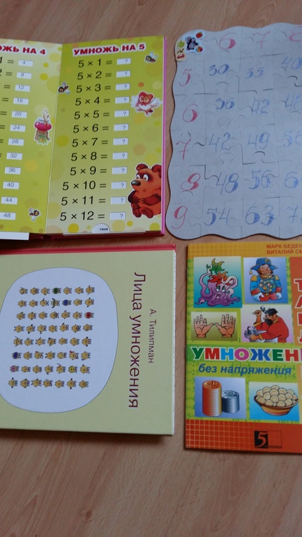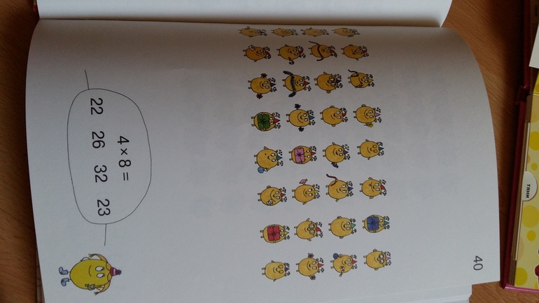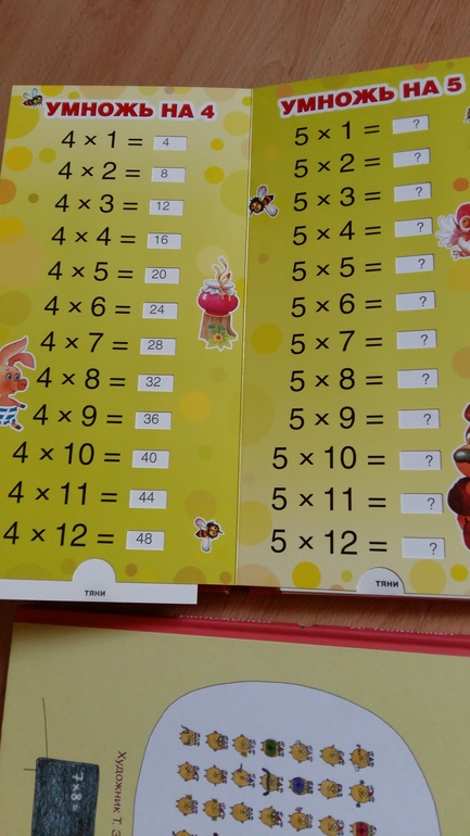 эту книгу Дима изучал еще в прошлом году. Для осознания умножения. Он пересчитывал "зверьков" и правильный ответ выбирал. Так же он тогда научился считать рядами. Например на 6 умножили - считал 6.12.18 и т.д.
