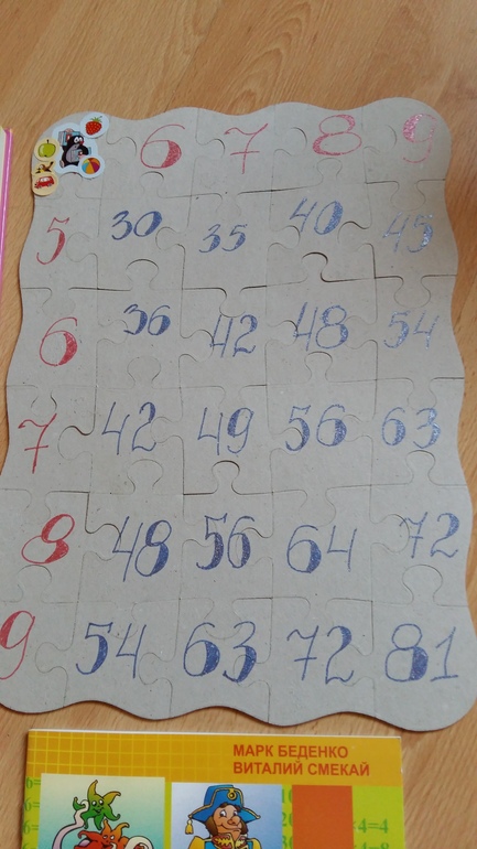 Только встал вопрос как? Ну и тут пришла еще одна идея. Делюсь. Взяла старые крупные пазлы нужно порыться еще, может найду такие, что-бы на всю таблицу хватило. Не все цифры получились, но эти думаю для детей самые сложные. На 5 таблицу Дима знает по часам. На два он знает, что две цифры нужно сложить. На 3 и 4 выучим и так. В принципе секрет цифры 9 он знает, но пусть выучит наизусть лучше. Точнее не заучит, а зрительно в игре запомнит.