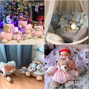 Ночник — игрушка Мишка М и из хлопка. В середине животика игрушки расположена лампа ночник. При первом нажатии-включается свет, при втором-свет и музыка, при третьем-отключение. Свет лампочки не нагревает мишку, поэтому малыш может спать обняв мишку.