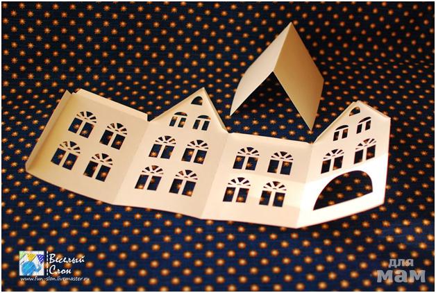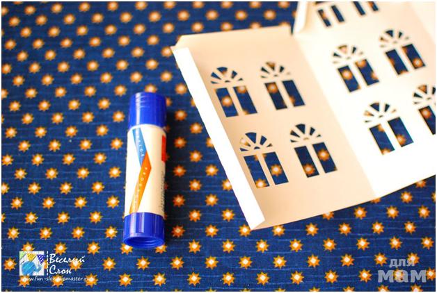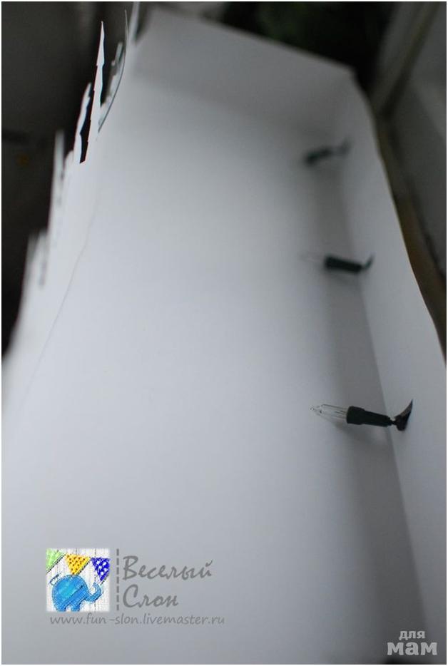 Намечаем отверстия под электрическую гирлянду напротив домиков. Вместо гирлянды можно использовать греющую свечу с искусственным пламенем. Прорезаем отверстия и вставляем фонарики гирлянды.