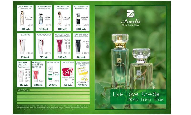 Продукция Армэль представлена в каталоге, где можно подробно изучить весь ассортимент компании. Стоит обратить внимание, все духи выпускаются с концентрацией parfum, что свидетельствует о стойкости ароматов.