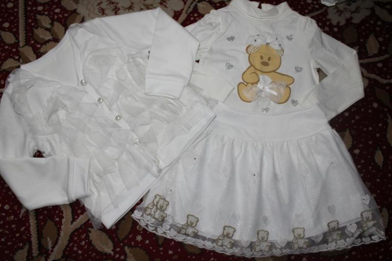 комплект de salito/ нереальной красоты. кофточка на трикотаж.подкладке. перед в чешуйках из сеточки,пуговки со стразиками. водолазка вся в стразах и жемчужинках. рукавчики фонарики.юбочка многослойная,в меру пышная.стразики мишки-очень нежная.есть утяжка.комплект одет 1 раз.в состоянии нового.размер указан 104.можно с 98 носить и до 106. в подарок отдам подходящие колготки дорогой фирмы молочного цвета красивущие