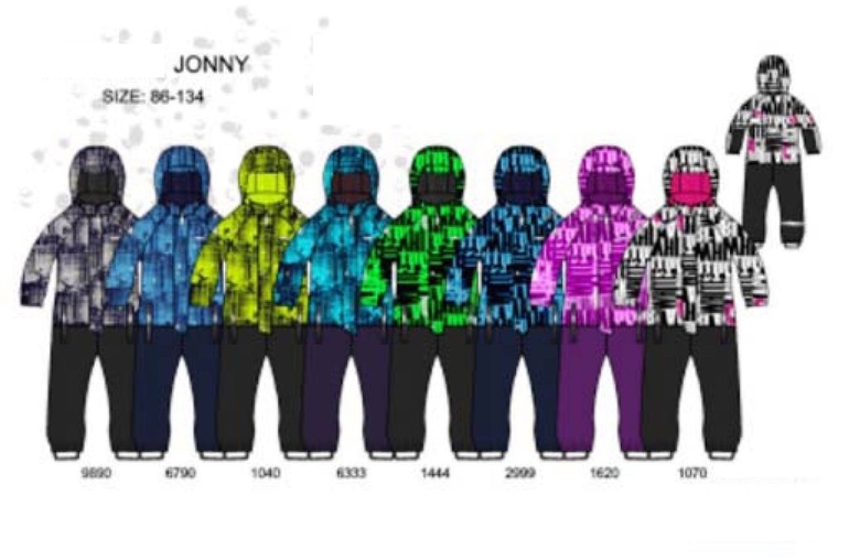 7. Комбинезон для мальчиков и девочек JONNY арт 427 ЦЕНА 7200 руб выполнен в ярких цветах из ткани ACTIVE. Ткань комбинированная: верхняя часть - гладкая с принтом, низ - в рубчик. Утеплитель KERRYFILL 330 гр., проклеенные швы, внутренняя часть воротника и капюшон - плюш. Подкладка 100% полиэстер. Имеется одна молния и 2 боковых кармана со светоотражателем на молнии. На ножках,ручках и талии резинки, штрипки (ножки), светоотражатели. Есть кулиска внутри на талии.