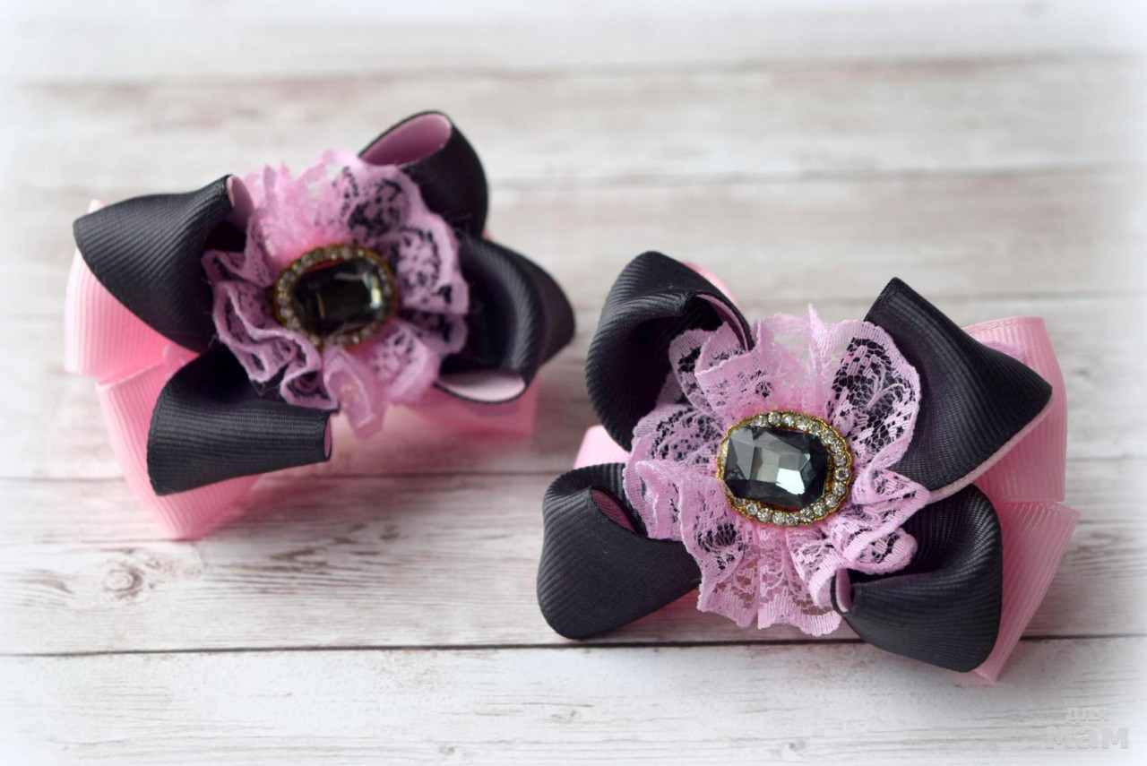 Очень удачное сочетание графитового и нежно-розового цвета. Бантики небольшие. Идеально для косичек. Размер 6,5 см