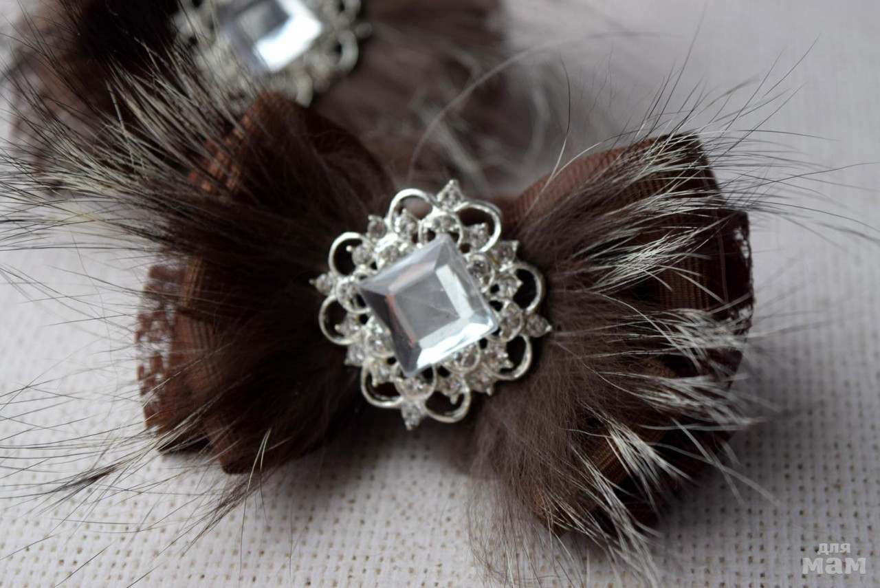 Бантики категории люкс. Вкусный шоколадный цвет и натуральный мех чернобурки. Модель разбавлена кружевом. Резинка в тон. Нижний бантик основа - 8,5 см. По иглам меха не мерю, ибо они от малейшего дуновения "разлетаются" и на их длину, наверное, не стоит ориентироваться. Но визуально не смотрятся малышами!