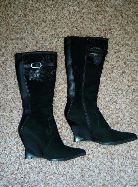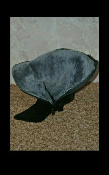 На узкую ножку, натуральная замша с кожаными вставками, мех густой натуральный. Бу пару раз, в хорошем состоянии. Остроносые, очень удобные.
