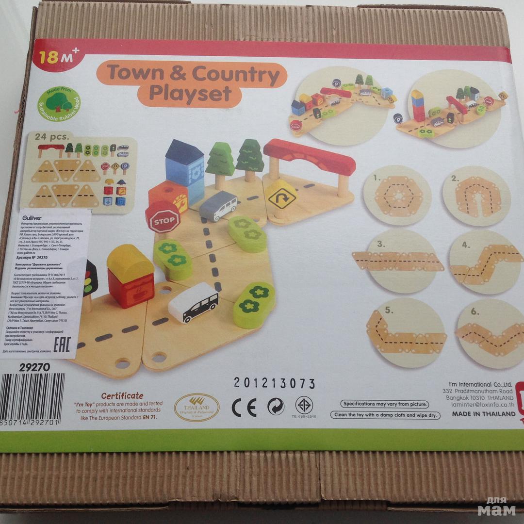 В комплект входят деревянные игрушки - 6 элементов дороги, 6 фигурок для постройки зданий, 2 машины, светофор, 2 дерева, 3 клумбы с цветами, 3 дорожных знака, арка.