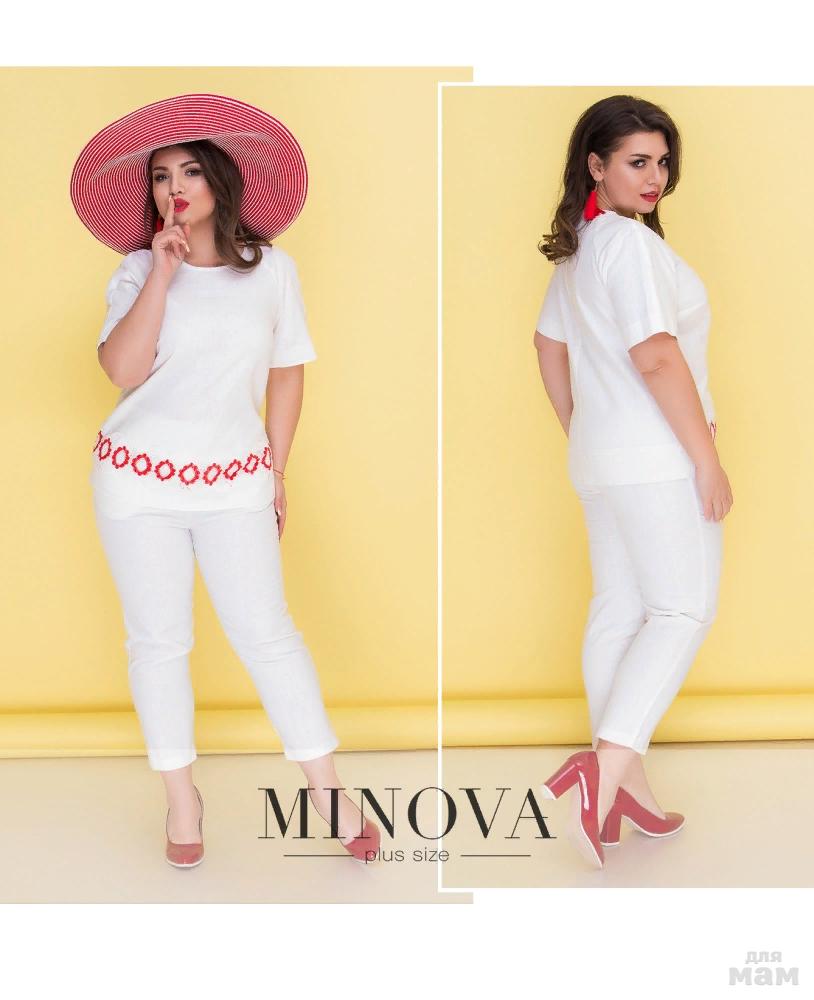 Яркий летний брючный костюм состоит из свободного топа с короткими рукавами и зауженных брюк. Удлиненная кофта прямого кроя внизу украшена кружевной лентой. Брюки с карманами на высокой посадке застегиваются на пуговицу и молнию.