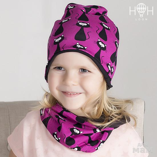 7)В18-54флк Двухсторонняя шапка, кошки на фиолетовом / ерный,210р+15%=241,5