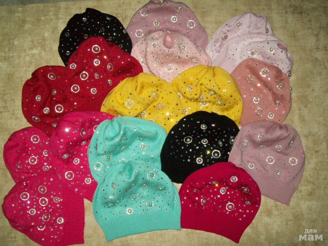 Античная роза - 52-54 - 2 шт. Желтые - 52-54 - 1 шт. 53-55 - 1 шт. Вишневые - 52-54 - 1 шт., 53-55 - 1 шт. Пудра - 48 - 1 шт. Бледно-розовые 52-54- 1 шт. 53-55 - 1 шт.. Розово-персиковая 52 - 1 шт. Неоновая фуксия - 54-56 - 1 шт. , 53-55 - 1 шт. 52-54 - 1 шт. Насыщенная фуксия (на переднем плане) - 51-53 - 1 шт. Черные. с камнями без страз вокруг 52-54 - 1 шт., со стразами 52-54. Все шапки на этом фото по 950 р.