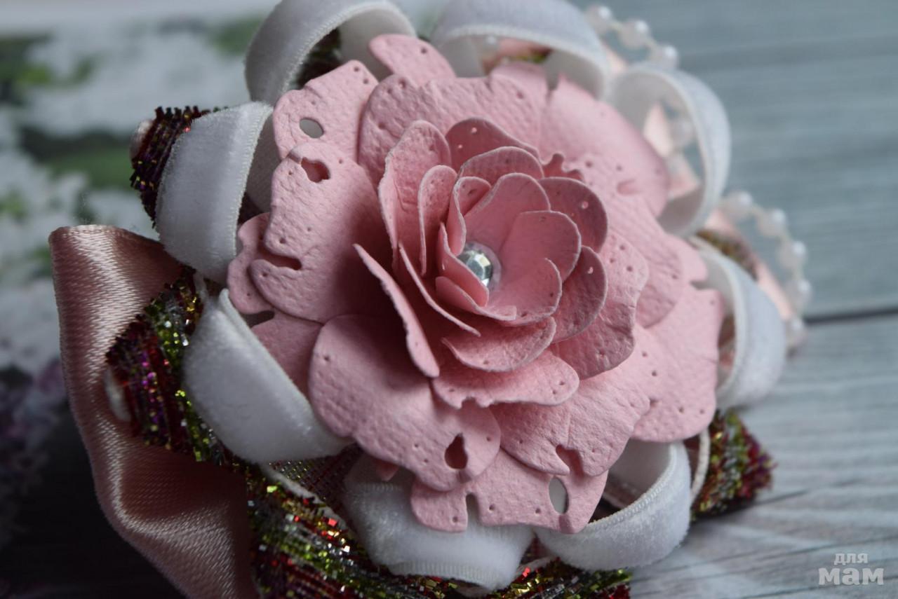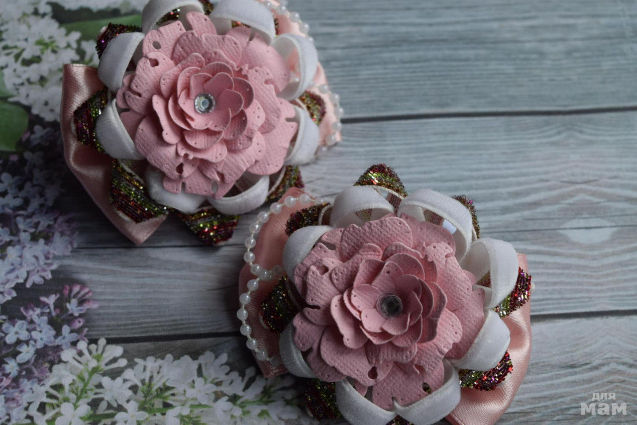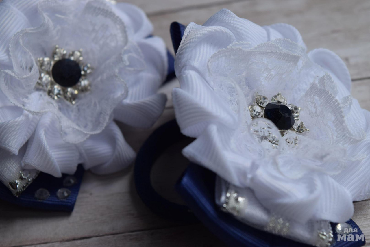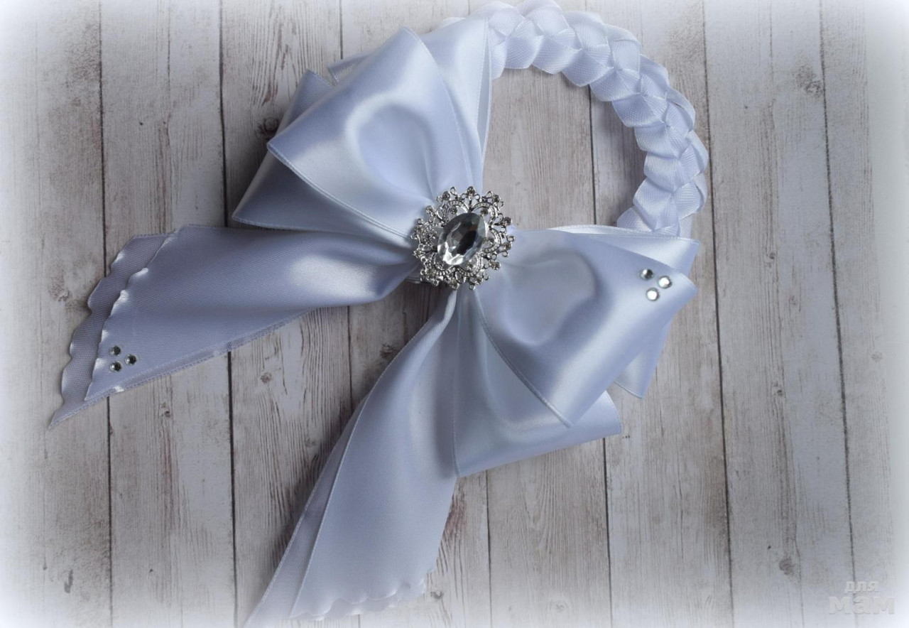 Очень красивое украшение на пучок для серьезных первоклашек)) или девочек постарше. Ничего лишнего - спереди идет декоративная косичка, сзади-шикарный бант и кабошон с подвеской (на фото спрятался)). Бант сделан с маленьким секретиком, который не позволит ему смяться до вида плоского блинчика))) Украшение для пучка 7-10 см.