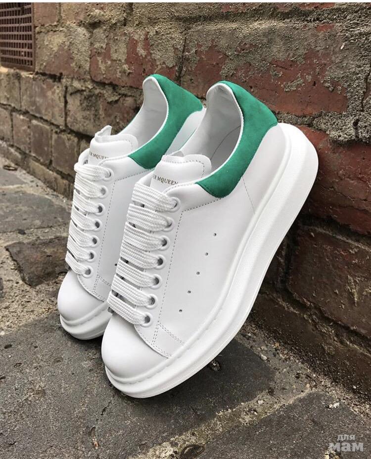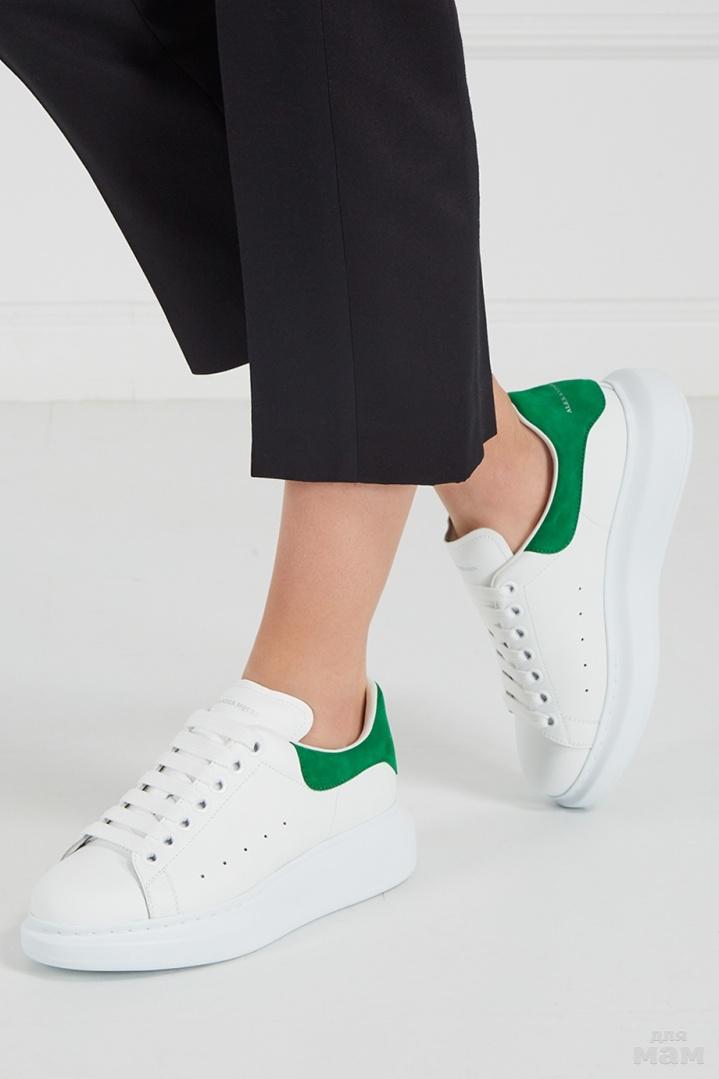 Белые кроссовки на шнуровке из гладкой кожи с закруглённым носком и замшевой деталью контрастного цвета на заднике. Широкие плоские шнурки. На заднике и язычке: логотип Alexander McQueen. Выступающая резиновая подошва.