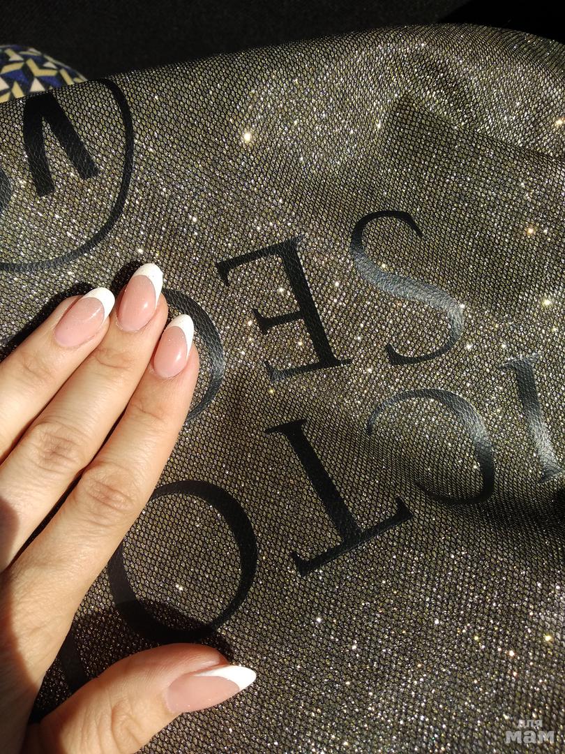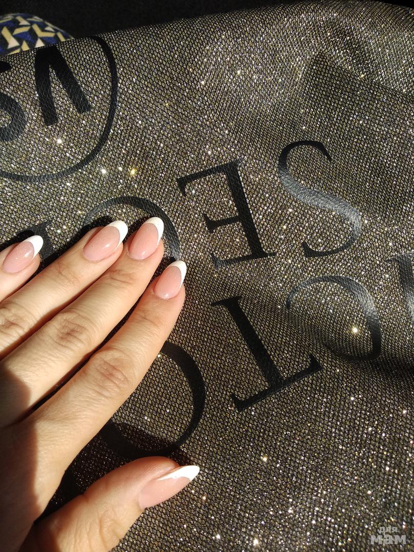 Не реальный френч. Гель. Очень довольна. Публикую фотку. Ногти миндаленки на сумочке моей блестящей.