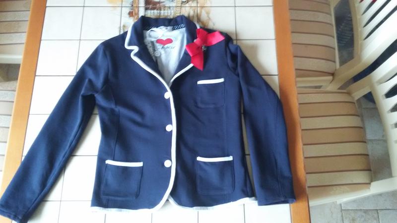 Трикотажный пиджак, 95% хлопок, 5% эластан. Идеален для школы, состояние отличное, притален по силуэту, бантик на кнопке. Замеры:рукав-45см, подмышки-37см, длина-49см.