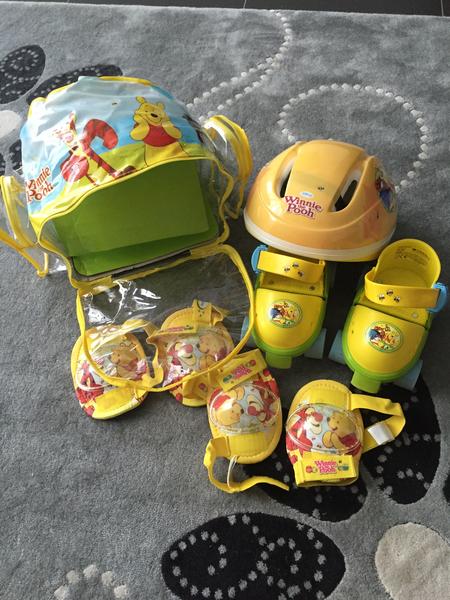 У детских роликов Винни Пух 4 колеса расположены так, чтобы ребенок не падал. В них также предусмотрены тормоза в носовой части и имеется 3 режима вращения с переключателем: колёса крутятся вперед и назад, колёса крутятся только вперед, колёса не крутятся.