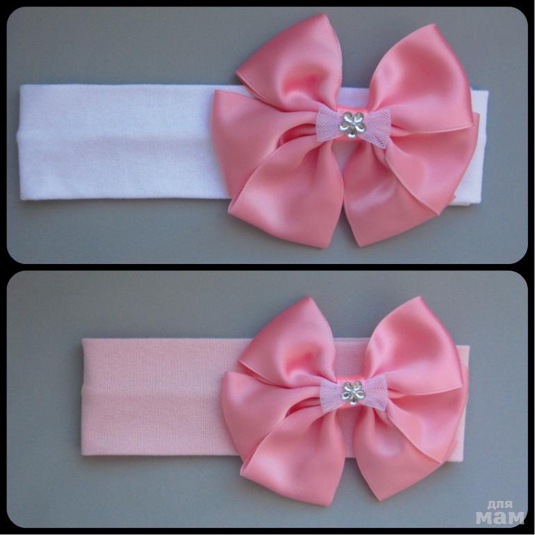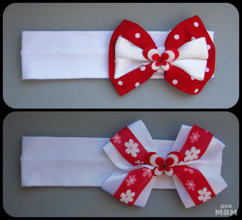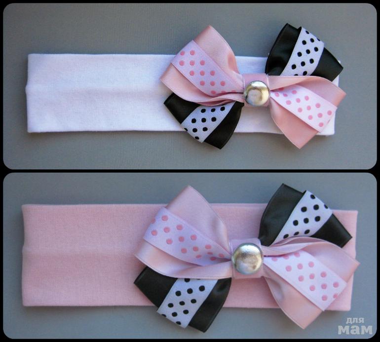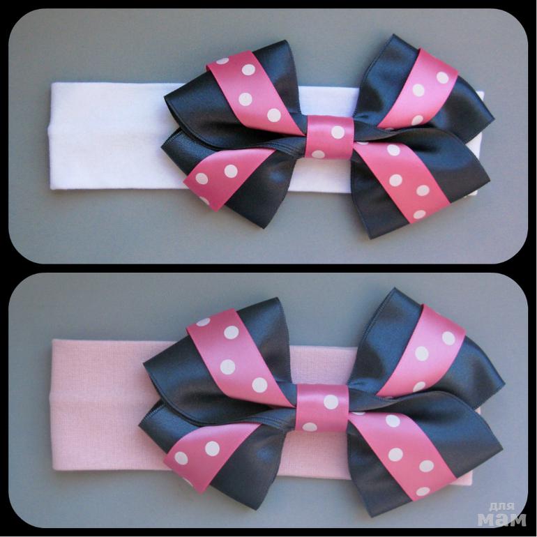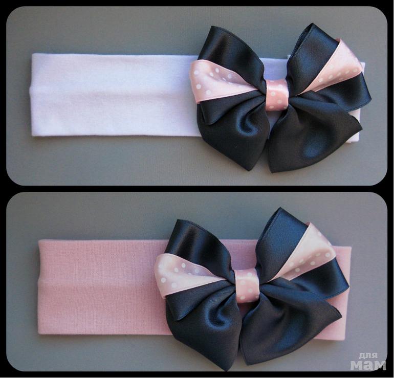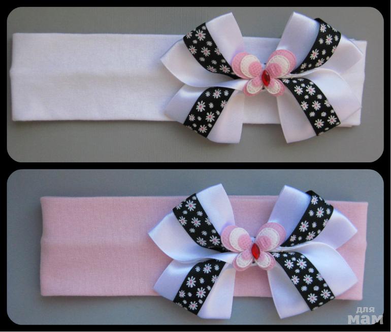 Повязки трикотажные с бантиками, белые и розовые. Некоторые повязки комплектуются к одежде. Банты взаимозаменяемые на липучке или кнопке (уточняйте, если принципиально).