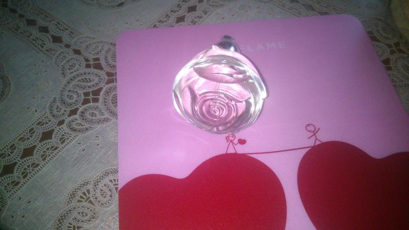 а флакон...хм, не флакон, а песня...Выполнен в виде хрустальной чайной розы...с крышечкой в виде чашелистика со стебельком... Изумительно красивый флакон, который может спокойно лежать на боку, словно уснувшая розочка...