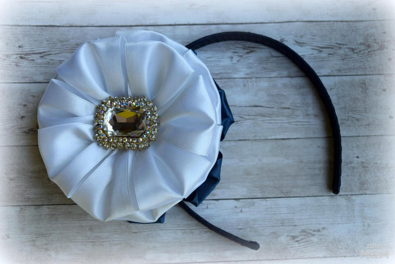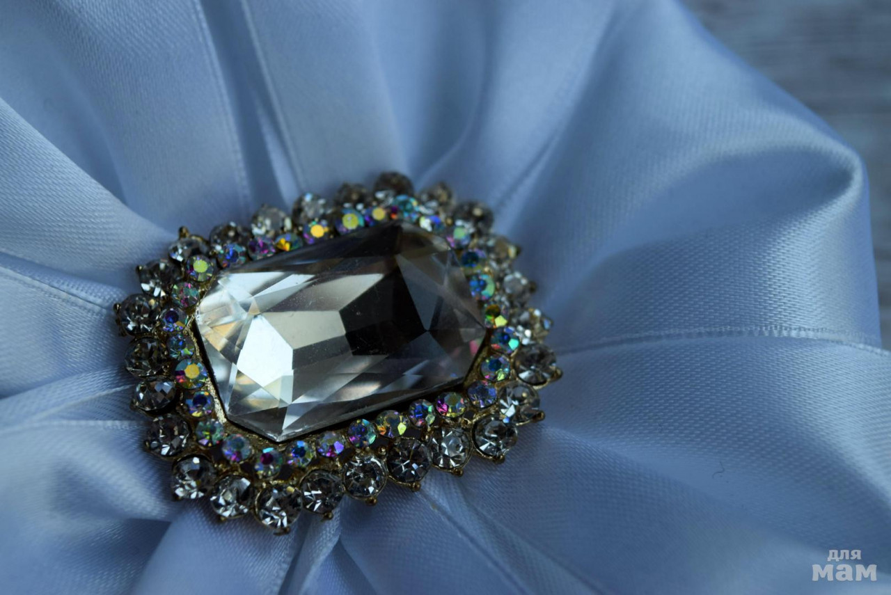Аналогичный камень украсил свадебный наряд невесты, а этот поселился на школьном аксессуаре. Бант большой - около 12 см. Не смотря на свои солидные размеры достаточно легкий. Дискомфорта никакого не доставит. Кабошон с двойным креплением! Главное не ронять)