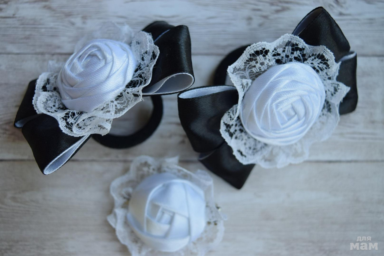 2) Для самых практичных. Набор в классическом цвете - черно-белой гамме. Состоит из пяти предметов - галстук, пара резиночек и заколка.