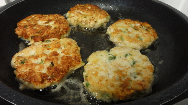 Дайте массе постоять минут 15-20. Нагрейте сковороду с маслом, убавьте огонь до среднего. И жарьте как обычные оладьи, по паре мину с каждой стороны. Выкладывайте ложкой массу и слегка размазывайте - придавая форму оладьев прямо на сковороде.