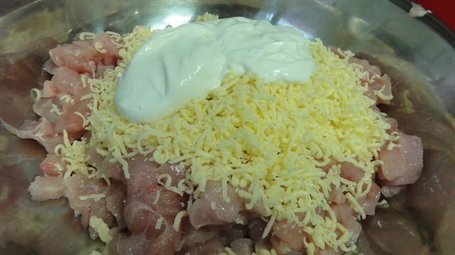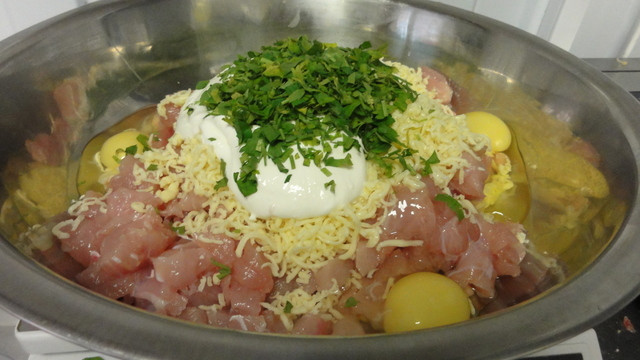 Потребуется: 1 килограмм куриного филе 200 граммов твердого сыра 150 граммов муки 150 граммов сметаны (или кефира) 1 чайная ложка соли с верхом 4 яйца Пучок укропа или петрушки И растительное масло для жарки