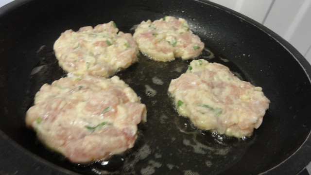 Куриное филе, да ещё и порезанное настолько мелко - готовится очень быстро. Поэтому не подстраховывайтесь пережаривая и пересушивая оладьи. Увидели что мясо поменяло цвет больше чем наполовину - переворачивайте и дожаривайте с другой стороны.