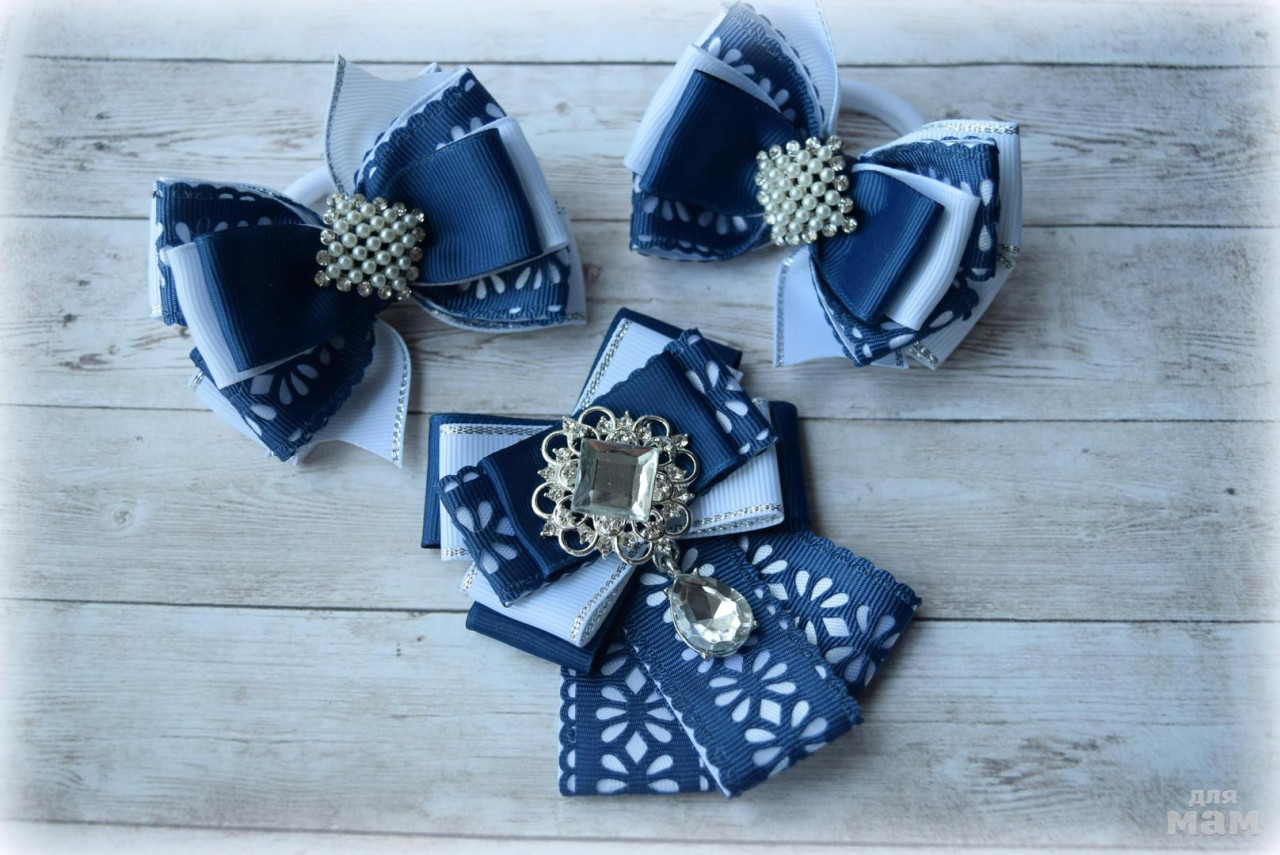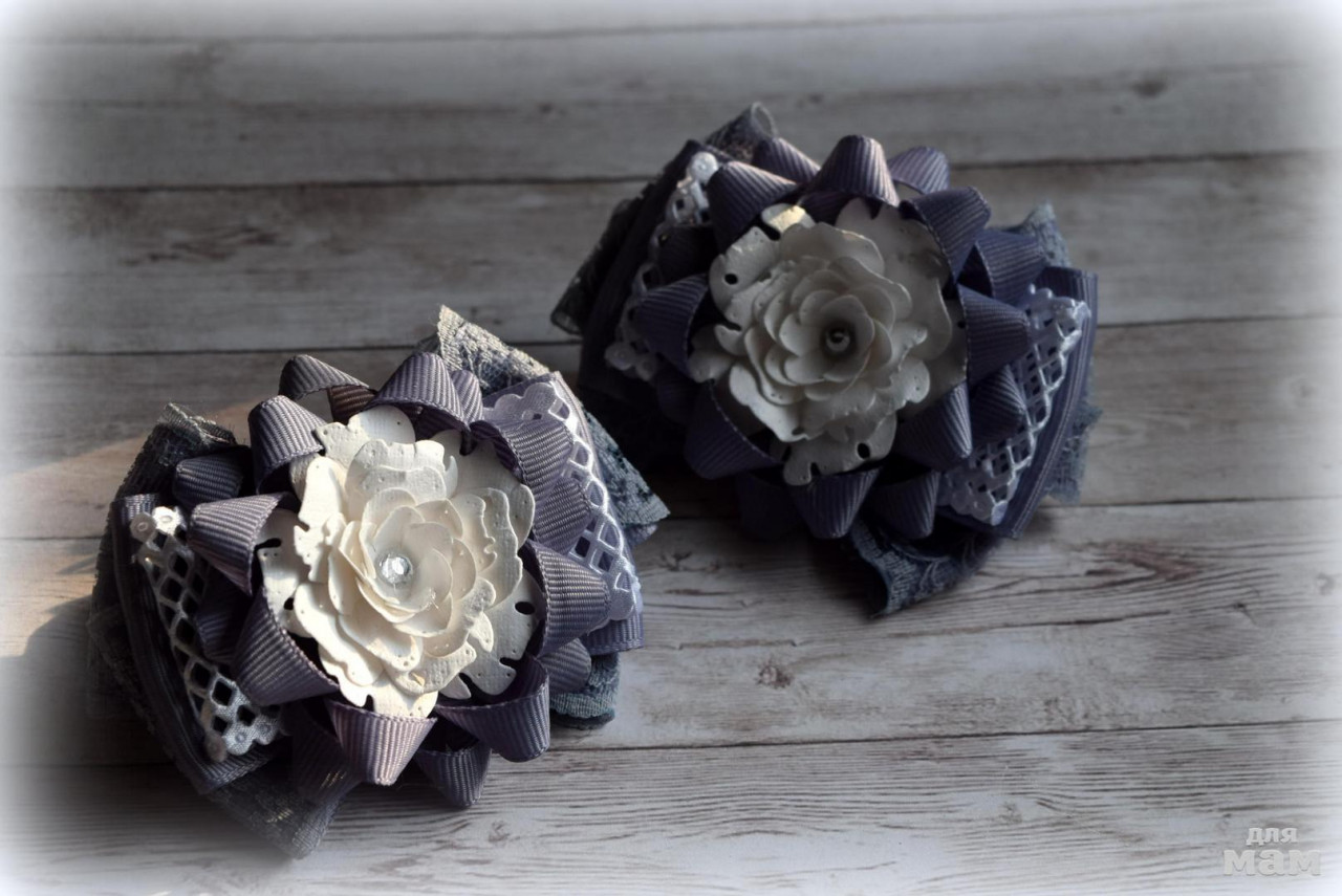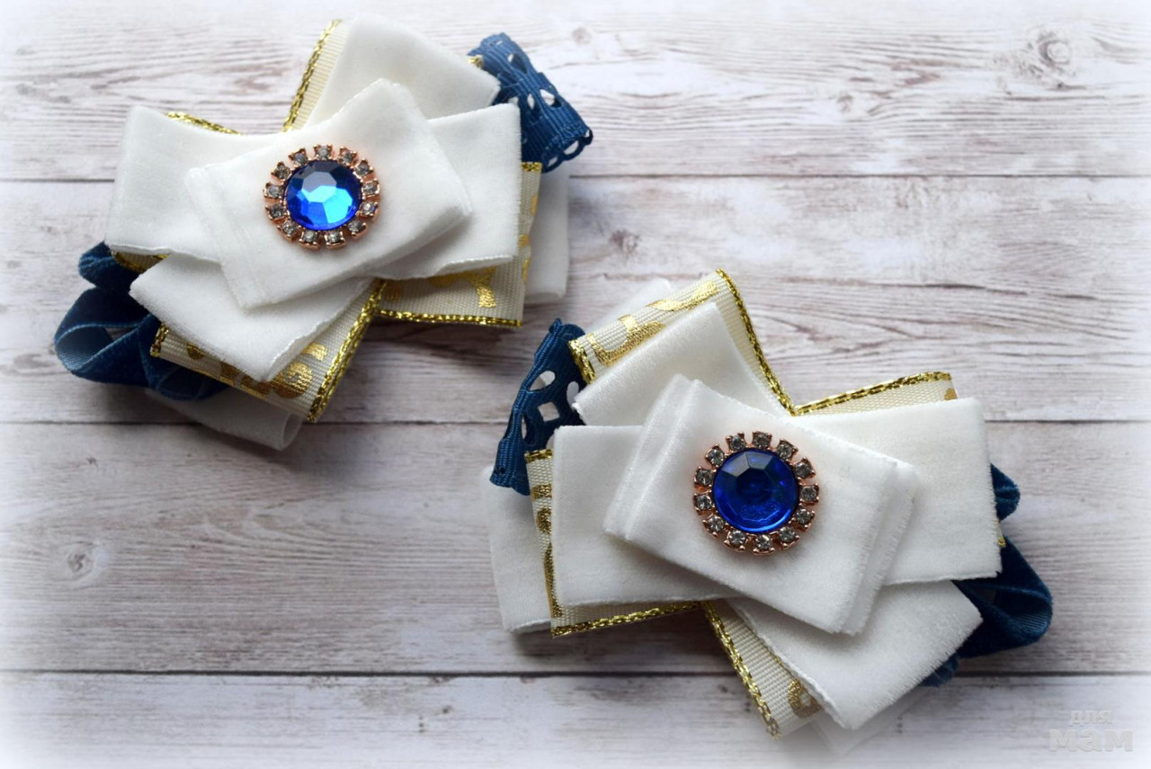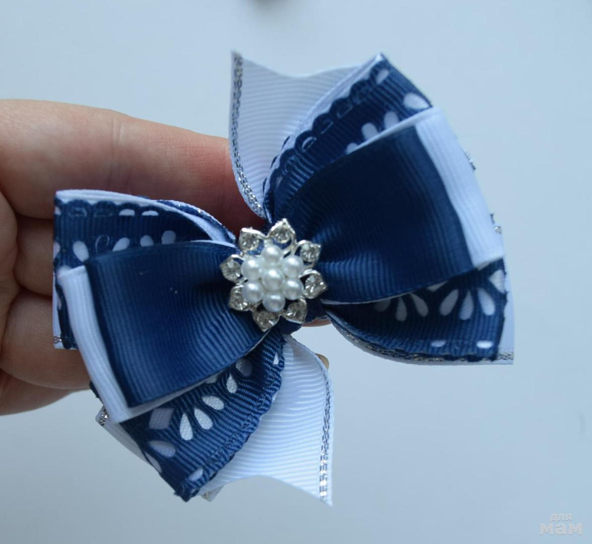 Очень красивое украшение на пучок для серьезных первоклашек)) или девочек постарше. Ничего лишнего - спереди идет декоративная косичка, сзади-шикарный бант и кабошон с подвеской (на фото спрятался)). Бант сделан с маленьким секретиком, который не позволит ему смяться до вида плоского блинчика))) Украшение для пучка 7-10 см.