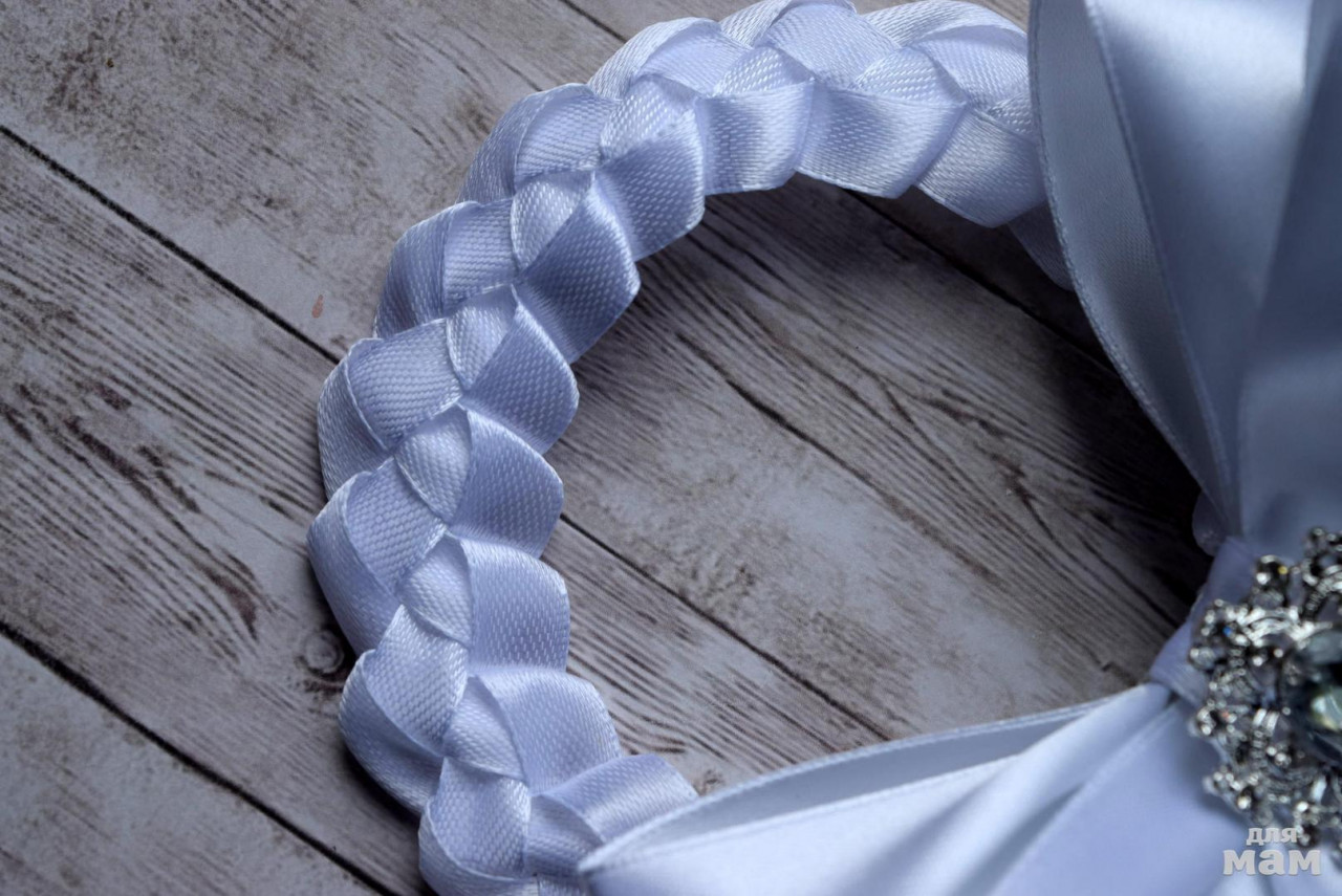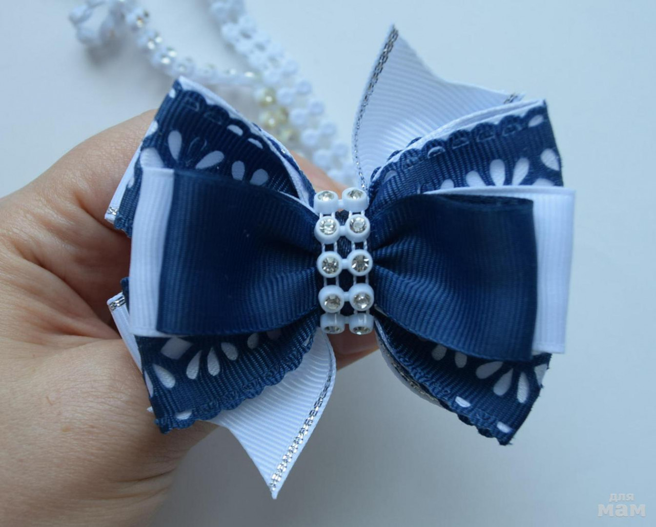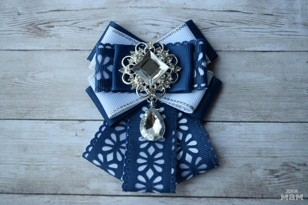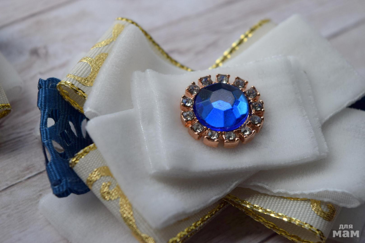 Очень красивое украшение на пучок для серьезных первоклашек)) или девочек постарше. Ничего лишнего - спереди идет декоративная косичка, сзади-шикарный бант и кабошон с подвеской (на фото спрятался)). Бант сделан с маленьким секретиком, который не позволит ему смяться до вида плоского блинчика))) Украшение для пучка 7-10 см.