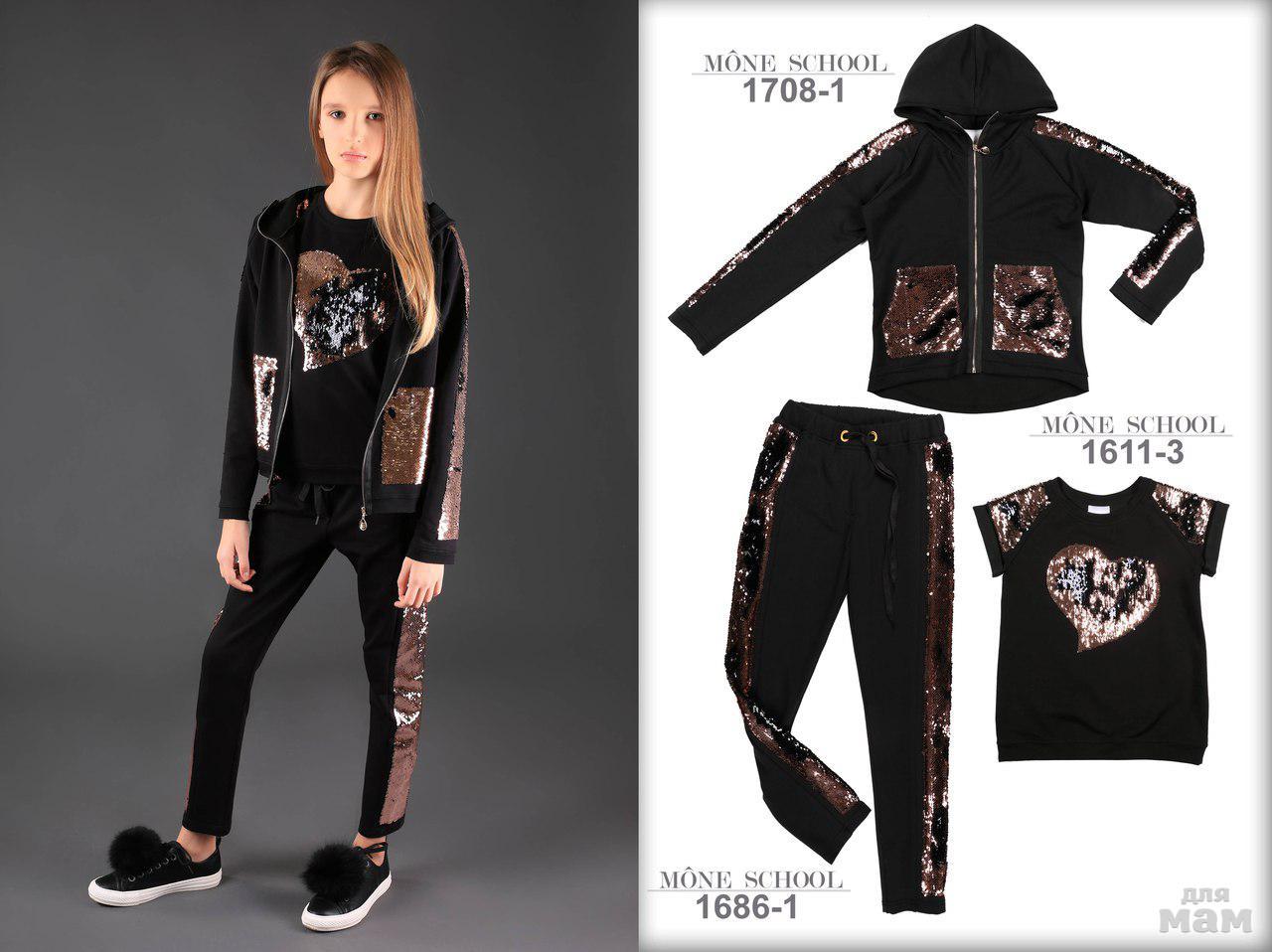 1686-1 брюки трикотаж двунить, паетка черный 60%хлопок 30%синтетика 10%лайкра 122-152 цена 2000