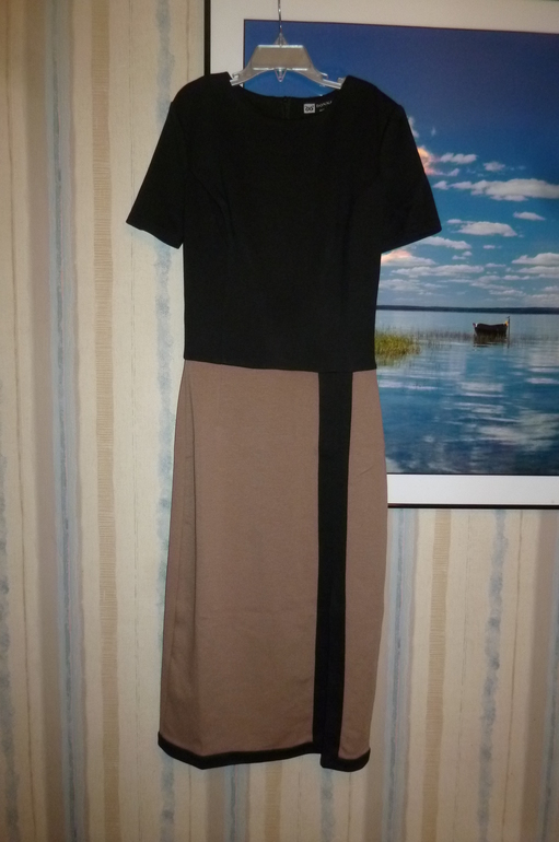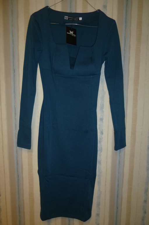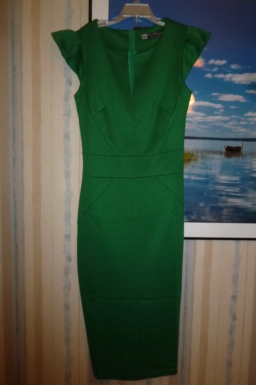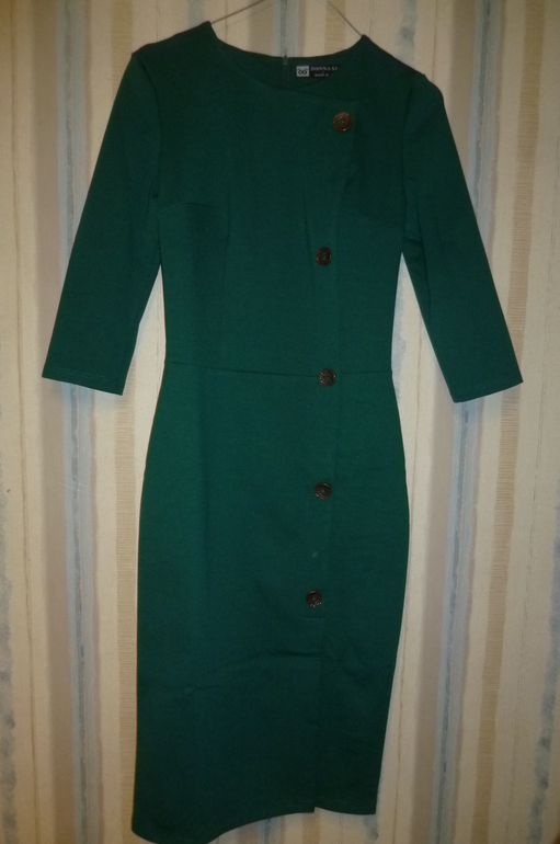 Черное платье меньше чем зеленое, хотя тоже 44. Ткань так себе, почти не тянется, отвратительно пахнет- дешевой синтетикой, швы обработаны плохо,но само платье на мне смотрится хорошо, правда,жмет в плечах и велико в талии и груди, отдала в ателье, немного ушьют и будет супер, с учетом того что оно обошлось в 1400 при покупке-оно того и стоило))
